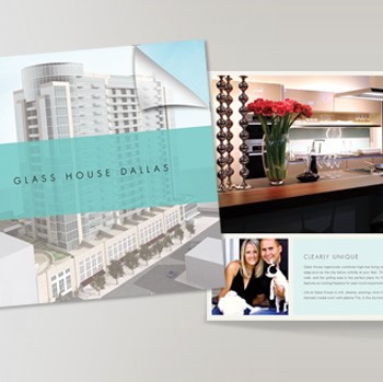 Glass House was a new condo in Dallas. We (directed by Jim Foley) designed a very successful launch, with brochures, website, POP and PR including tours and radio. We did have to remove the ferociously large “Now Leasing!” banner we hung outside the 18th floor, though.